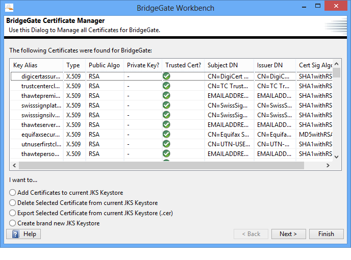 Open the BridgeGate Workbench. From the main menu, select File → SSL Certificate Manager. From the SSL Certificate Manager screen, select the radio button option to 'Add Certificates to current JKS Keystore' and click Next. The next screen presents you with many options for importing SSL public keys, also known as SSL Certificates.