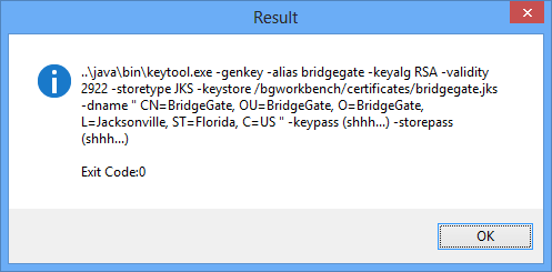 When you are done filling in this information, click Finish. The application will pause for a few seconds as it creates the SSL keypair. A message window will appear with the command line information that BridgeGate used to create the keypair, along with an Exit Code. Ensure the Exit Code is 0 for successful creation.