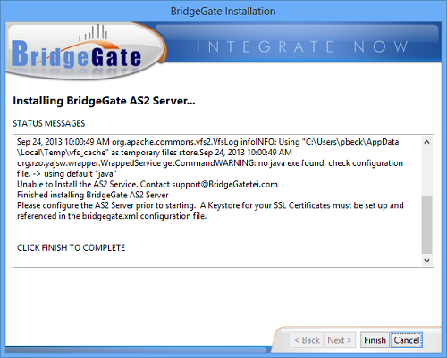 The installation script does not attempt to start the BridgeGate™ AS2 Server. Further configuration is required prior to running the server for the first time.