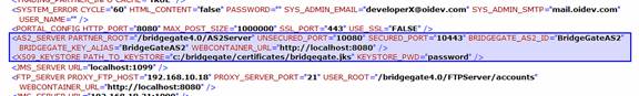 Now you have a valid JKS Keystore, containing your public/private SSL keypair and the public SSL key from each participant you will send and receive AS2 Messages from. Now you must tell BridgeGate™ Server where to find the file, and the password to access it. To do this, open the file %BG_ROOT%/conf/bridgegate.xml using a text editor or XML editor. Modify the following XML configuration elements, <AS2_SERVER> and <X509_KEYSTORE>: